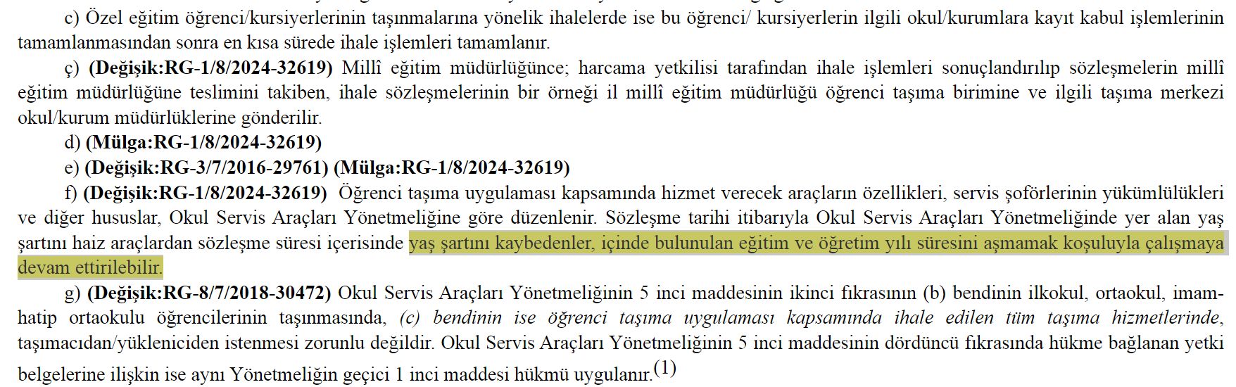 “Sözleşme itibarıyla Okul Servis Araçları Yönetmeliğinde yer alan yaş şartını haiz araçlardan sözleşme süresi içerisinde yaş şartını kaybedenler, içinde bulunulan eğitim ve öğretim yılı süresini aşmamak koşuluyla çalışmaya devam ettirilebilir.“